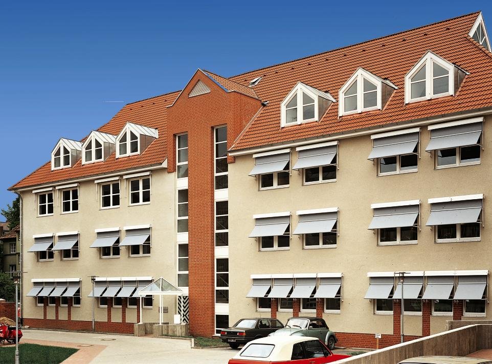 Bei unseren Fassaden-Markisen ist das Tuch nach vorn ausgestellt, anstatt senkrecht an der Fassade ausgerichtet. So ist auch bei ausgefahrener Markise die ungehinderte Durchsicht nach draußen möglich.