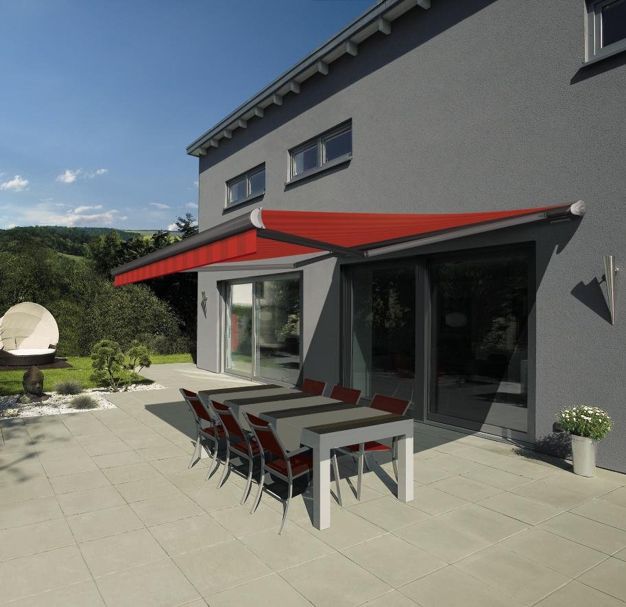 Die halbgeschlossenen Gelenkarm-Markisen bringen Farbe. Licht und luftige Atmosphäre auf Terrassen in harmonischen Einklang. Das integrierte Regenschutzdach nimmt Tuch und Technik dabei buchstäblich in Schutz.