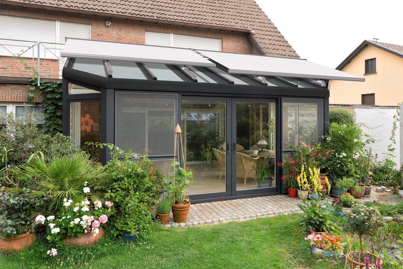 Ein Wintergarten mit seinen großen Glasflächen stellt besondere Anforderungen an den Sonnenschutz: Er muss sich auch in ungewöhnlich geschnittene Glasfassaden einfügen - und dort auch montierbar sein. Aber er darf auch nicht zu wuchtig wirken.