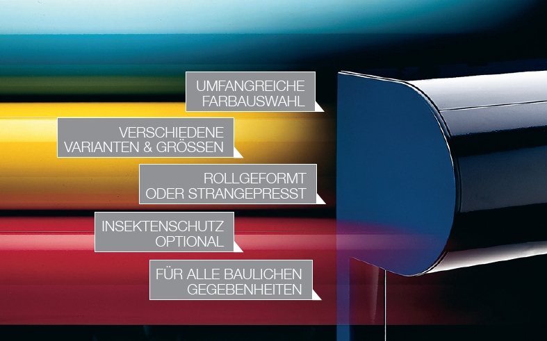 Die Kastenblenden bestehen aus rollgeformtem oder stranggepresstem Aluminium. Die Kastenform ist 20 Grad abgeschrägt, gerade, abgerundet oder überputzbar. Kopfstücke aus Aluminium Druckguss. Die Achtkantstahlwelle ist kugelgelagert. Vorbaurollladen können mit einem integrierten Insektenschutzsystem ausgestattet werden. Rollladenführungsschienen mit Neopreneinlage sind in Ausführung und Farbe dem Kasten angepasst. Der Behang ist wahlweise ein Kunststoff- oder Aluminiumrollladen oder ein Raffstore RS 80. Die Heinzmann-Endleiste ist voll in den Kasten einziehbar. Der Rollladen verriegelt automatisch durch beflockte Heinzmann-Sperrfedern, die gleichzeitig ein Zerkratzen der Rollladenstäbe verhindern.
