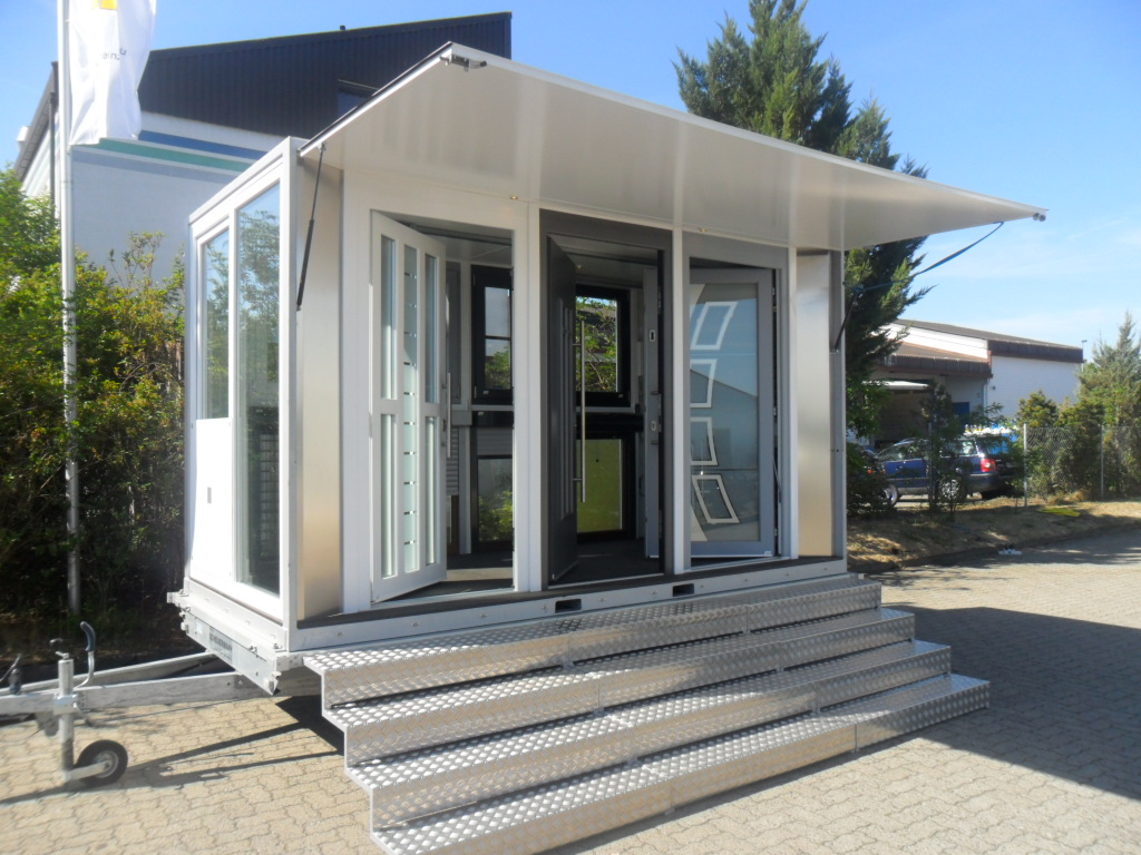 Heinzmann-Mobilo, der Messestand auf Rädern, beinhaltet alle Produktgruppen von Heinzmann, von der Aluminiumhaustür über Kunststofffenster und Garagentor bis hin zum Fertigelement und elektronischen Bedienelementen. Der Wagen ist mit einer handelsüblichen 230 V-Campingwagen-Steckdose ausgerüstet, die alle stromabhängigen Komponenten, wie biometrische Zugangskontrollen oder Garagenfernsteuerungen funktionieren lässt.